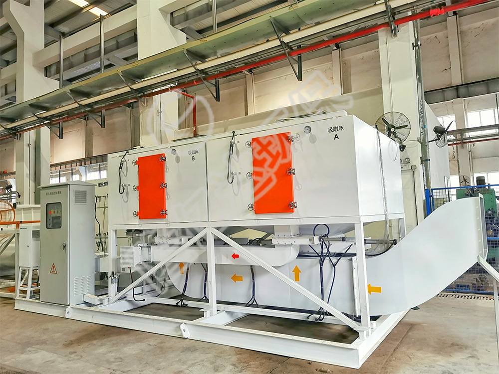 2、活性炭脫附再生流程:當(dāng)吸附床吸附飽和后,可啟動脫附風(fēng)機對該吸附床脫附,脫附氣體首先經(jīng)過催化床中的換熱器,然后進(jìn)入催化床中的預(yù)熱器,在電加熱器的作用下,使氣體溫度提高到280℃左右,再通過催化劑,有機物質(zhì)在催化劑的作用下燃燒,被分解為CO2和H2O,同時放出大量的熱,氣體溫度進(jìn)一部提高,該高溫氣體再次通過換熱器,與進(jìn)來的冷風(fēng)換熱,回收一部分熱量。從換熱器出來的氣體分兩部分:一部分直接排空;另一部分進(jìn)入吸附床對活性炭進(jìn)行脫附。當(dāng)脫附溫度過高時可啟動補冷風(fēng)機進(jìn)行補冷,使脫附氣體溫度穩(wěn)定在一個合適的范圍內(nèi)。